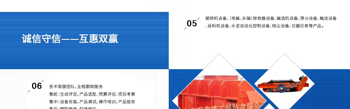 | 山東明鑫重工科技有限公司為是集科研開(kāi)發(fā),設(shè)計(jì)制造、銷售、安裝、調(diào)試為一體的技術(shù)制造企業(yè)。公司位于美麗的****風(fēng)箏都-濰坊市(國(guó)家AAAA級(jí)森林公園-沂山景區(qū)駐地)臨朐東城工業(yè)園。本公司產(chǎn)品種類有:破碎機(jī)設(shè)備,(電磁、永磁)除鐵器設(shè)備,磁選機(jī)設(shè)備,篩分設(shè)備,輸送設(shè)備,給料機(jī)設(shè)備,水泥自動(dòng)化控制設(shè)備、除塵設(shè)備,儀器儀表等產(chǎn)品。其產(chǎn)品有五十多個(gè)系列,四百多種規(guī)格,并可根據(jù)客戶需求設(shè)計(jì)生產(chǎn)相應(yīng)的產(chǎn)品。其產(chǎn)品廣泛應(yīng)用于冶金、電力、煤炭、礦山、造紙、食品、化工建材、耐火材料、磚瓦、水泥、玻璃等行業(yè),產(chǎn)品暢銷國(guó)內(nèi)三十多個(gè)省市、自治區(qū)。 |